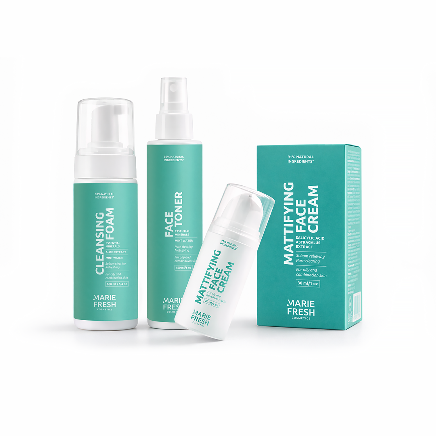 Nadmierne świecenie już po kilku godzinach, „spływający” makijaż i szybko tracąca matowość strefa T to typowe problemy skóry tłustej i mieszanej. Zestaw pomaga kontrolować wydzielanie sebum bez przesuszania. Pianka delikatnie oczyszcza i przywraca równowagę, tonik z hydrolatem mięty i fermentowanymi minerałami odświeża i normalizuje pracę gruczołów łojowych, a krem z kwasem salicylowym i cynkiem zapewnia długotrwały efekt matu i wyrównany koloryt. Skóra wygląda świeżo i pozostaje w równowadze przez cały dzień.