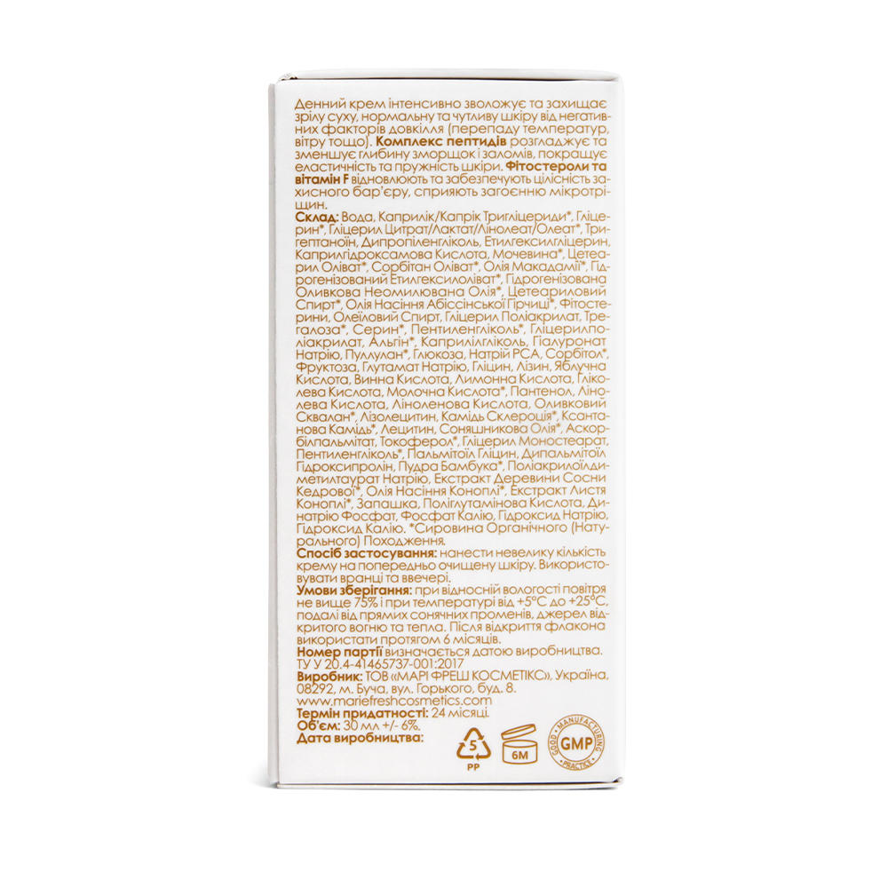 Денний крем інтенсивно зволожує та захищає зрілу суху, нормальну та чутливу шкіру від негативних факторів довкілля: перепаду температур, вітру тощо. Комплекс пептидів розгладжує та зменшує глибину зморщок і заломів, покращує еластичність та пружність шкіри. Фітостероли та вітамін F відновлюють та забезпечують цілісність захисного бар'єра, сприяють загоєнню мікротріщин. Зволожувальні комплекси з гіалуроновою кислотою інтенсивно зволожують шкіру, розгладжують зморшки, викликані сухістю, прибирають лущення та відчуття сухості.