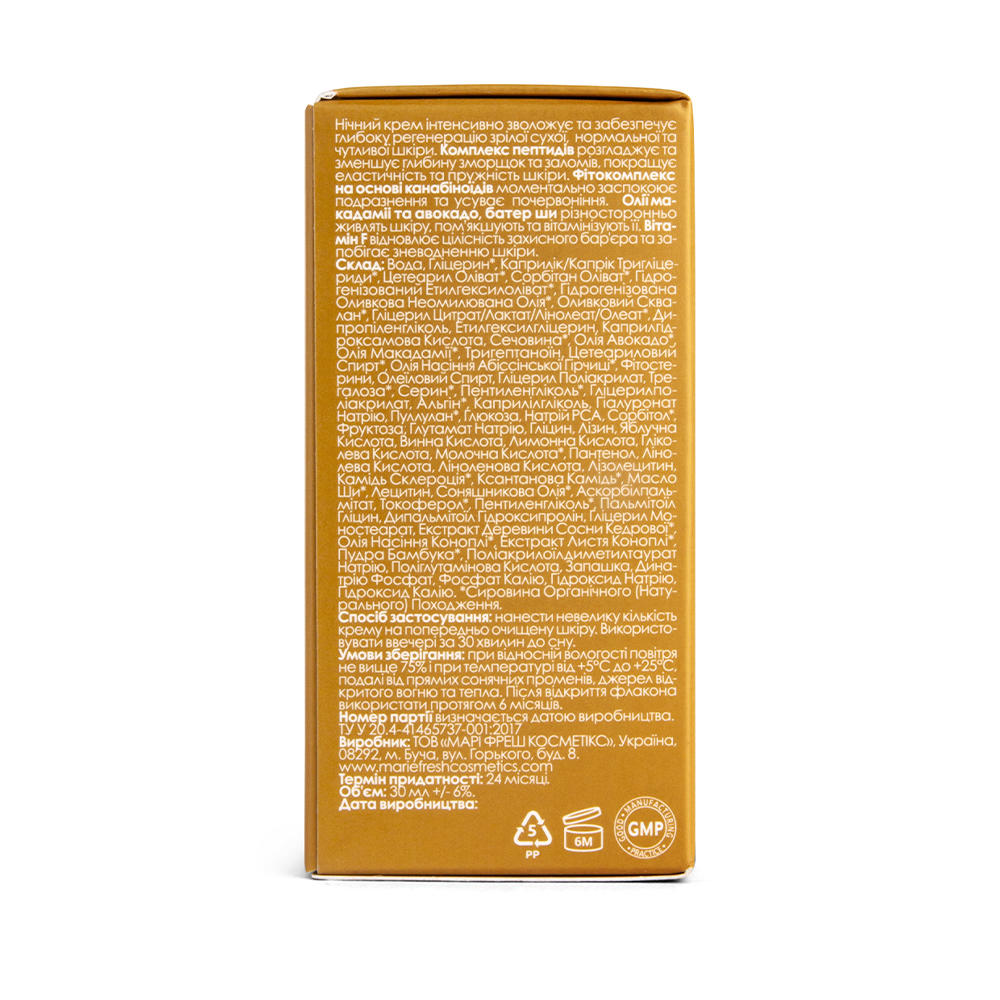 Нічний крем інтенсивно зволожує та забезпечує глибоку регенерацію зрілої сухої, нормальної та чутливої шкіри. Комплекс пептидів розгладжує та зменшує глибину зморщок та заломів, покращує еластичність та пружність шкіри. Фітокомплекс на основі канабіноїдів моментально заспокоюють подразнення та прибирають почервоніння. Вітамін F відновлює цілісність захисного бар'єра та запобігає зневодненню шкіри.