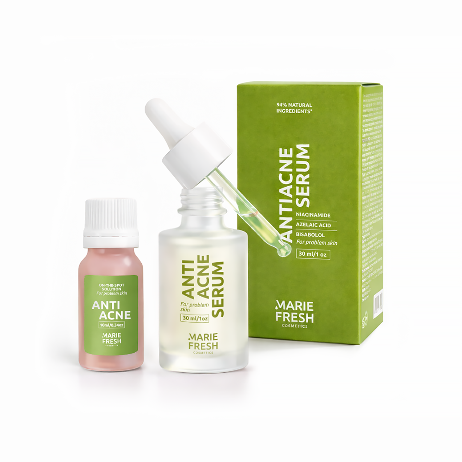 Висипання та почервоніння потребують швидкого й системного рішення. Набір поєднує щоденну сироватку з азелаїновою кислотою, ніацинамідом і бісабололом для зменшення запалення та контролю себуму з SOS-засобом із саліциловою кислотою, цинком і каламіном для точкової дії. Активні компоненти працюють проти бактерій, заспокоюють шкіру та вирівнюють тон. Шкіра виглядає чистішою та спокійнішою вже з перших днів.