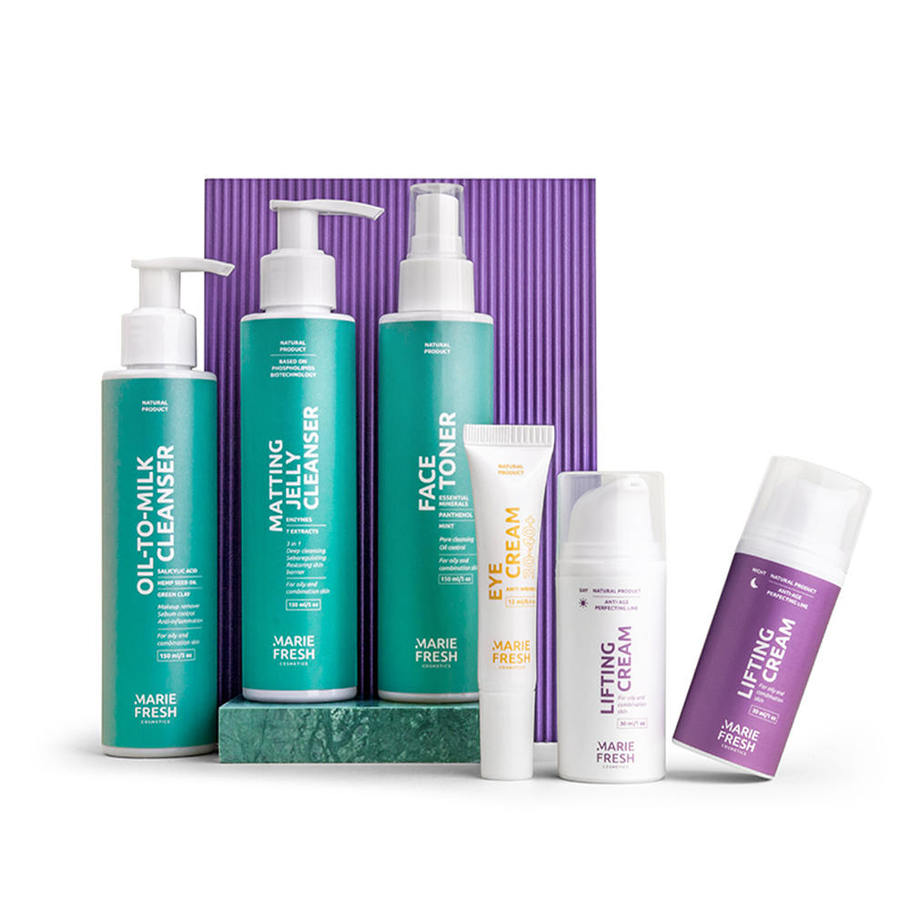 Жирна та комбінована шкіра зазвичай має деформаційний тип старіння, який супроводжується обвисанням шкіри, нечіткими овалами обличчя та тьмяною сірою шкірою. Комплексний набір складається з шести засобів і покриває всі обов’язкові етапи догляду: демакіяж, очищення, тонізація, зволоження та омолоджувальний ефект шкіри обличчя та повік. Збалансований склад кожного засобу спеціально комбінований, щоб в комплексі давати надзвичайний та помітний ефект - ліфтинг ефект, осяяний та рівномірний тон обличчя, гладкий рельєф шкіри, ефект наповненої та свіжої шкіри.
