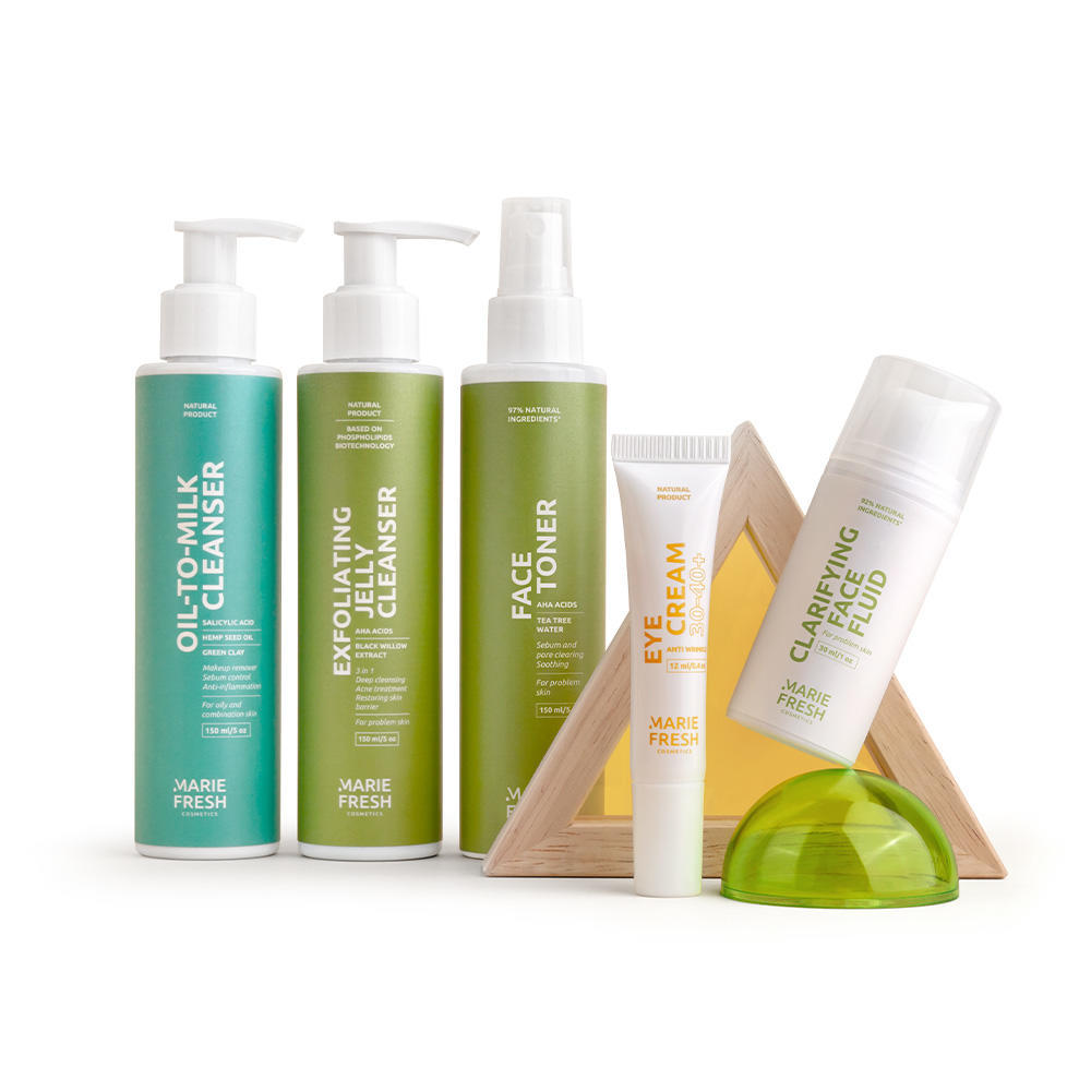 Комплексний догляд за зрілою проблемною шкірою включає в себе 5 етапів догляду. Гідрофільна олія Oil-to-milk Cleanser ефективно розчиняє забруднення, себум та накопичення в порах. Гель для вмивання з комплексом фруктових кислот полірує поверхню шкіри та підсушує висипання. Тонік з АНА кислотами покращує рельєф шкіри, освітлює вікову пігментацію та рубці після висипань. Крем-флюїд Anti-Acne з азелаїновою кислотою бореться з висипаннями та покращує тон обличчя. Крем для повік 30-40+ розгладжує зморшки навколо очей та прибирає синяву під очима.