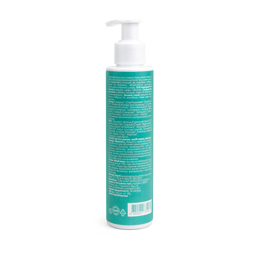 Мультифункціональний та фізіологічний очищувальний засіб нового покоління з неймовірно легкою, комфортною текстурою та з безпечним натуральним складом. Гідрофільна олія розроблена на основі двох емульгаторів, які забезпечують густу текстуру та ефективно розчиняють жирові забруднення, макіяж та шкірний себум. Текстура засобу покроково трансформується з олії в гель та з гелю в молочко. Таким чином очищення відбувається дуже делікатно, без стресу для чутливої шкіри. Завдяки олії насіння коноплі, саліциловій кислоті та зеленій глині засіб очищує пори, заспокоює шкіру, запобігає появі висипань та зменшує надмірний блиск шкіри.