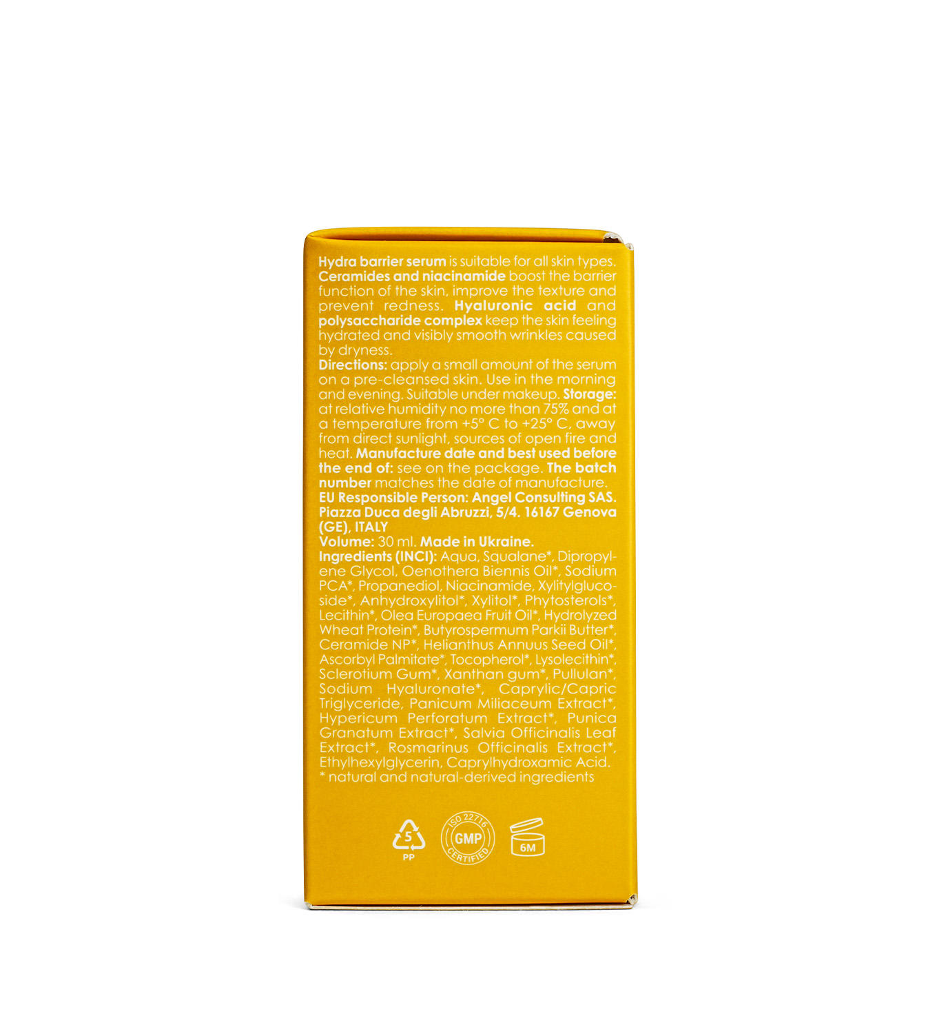 Вода, Сквалан*, Дипропіленгліколь, Олія Вечірної Примули*, Натрієва Сіль Пірролідонкарбонової Кислоти*, Пропандіол, Ніацинамід, Ксілітілглюкозид*, Ангідроксилітол*. Ксилітол*, Фітостероли*, Лецитин*, Оливкова Олія*, Гідролізовані Протеїни Пшениці*, Масло Ши*, Церамід NP*, Олія Соняшнику*, Аскорбіл Пальмітат*, Токоферол*, Лізолецитин*, Камедь Склероція*, Ксантанова Камідь*, Пуллулан*, Гіалуронова Кислота*, Каприлік/Каприк Тригліцериди*, Екстракт Проса*, Екстракт Звіробою*, Екстракт Гранату*, Екстракт Листя Шавлії*, Екстракт Розмарину*, Етилгексилгліцерин, Каприлгідроксамова Кислота.