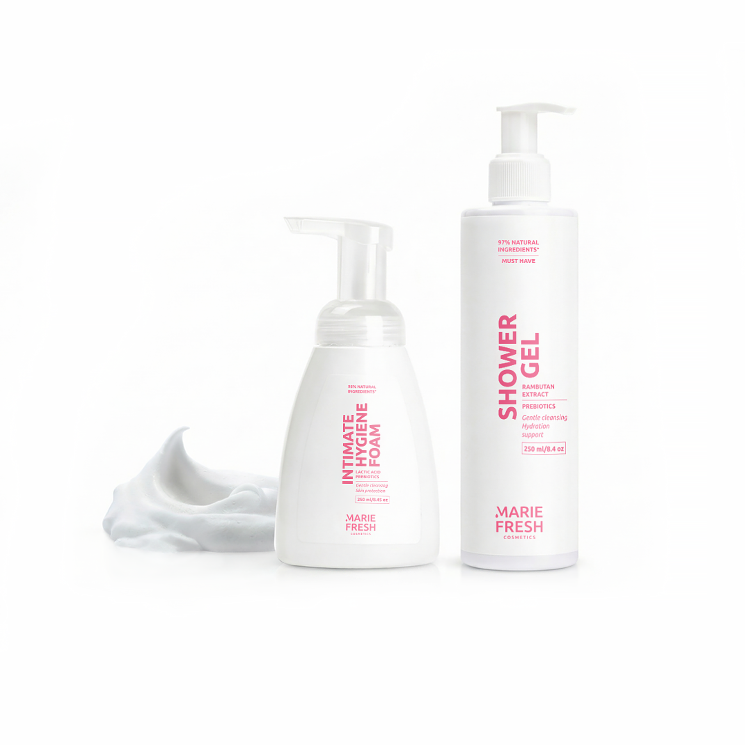 Сухость, ощущение стянутости и дискомфорт после душа могут возникать из-за агрессивного очищения. Набор обеспечивает деликатный уход без пересушивания. Пенка с ферментом лактобактерий и инулином поддерживает естественную микрофлору интимной зоны и снижает риск раздражений, а гель с экстрактом рамбутана и пребиотиками мягко очищает и помогает сохранять влагу.