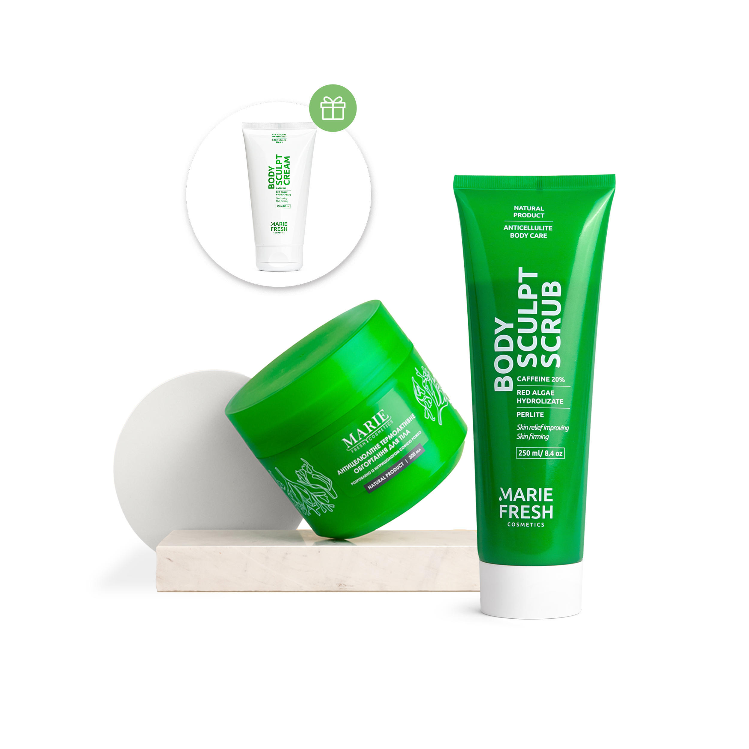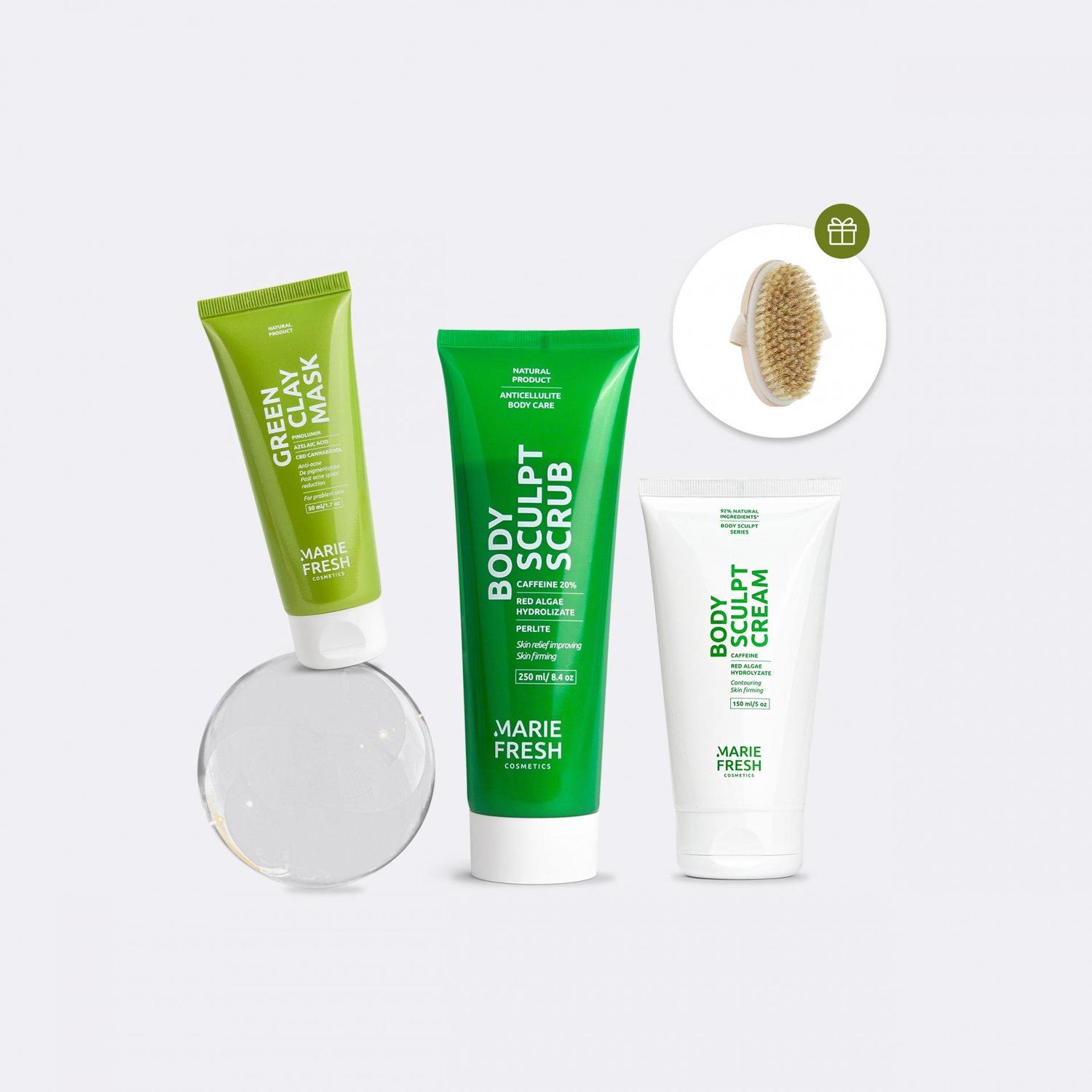 Эффективный набор для домашнего детокса организма. Маска с зеленой глиной регулирует выделение кожного себума и борется с высыпаниями, подкожными комедонами и другими воспалительными элементами. Липолитический крем для тела и антицеллюлитный скраб, разработанные на основе передовой запатентованной технологии CAFFEINE MICROPATCH® 24. Выводят лишнюю жидкость и токсины, стимулируют лимфодренаж, моделируют контуры тела, выравнивают рельеф кожи и борются с "апельсиновой коркой". А специальная массажная щетка, которую вы получите в подарок, усиливает эффект средств, активируя лимфоток и улучшая тонус