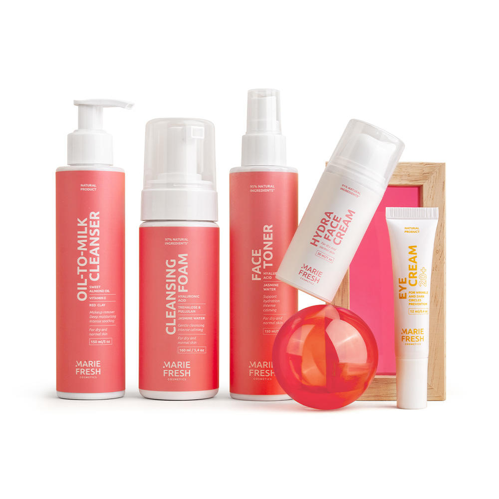 Комплексный набор состоит из пяти средств и покрывает все обязательные этапы ухода: демакияж, очищение, тонизация, увлажнение и защиту сухой и нормальной кожи лица и век. Сбалансированный состав каждого средства специально комбинирован, чтобы в комплексе давать чрезвычайный и заметный эффект – интенсивное увлажнение, борьба с ощущением сухости, уменьшение шелушений, успокоение покраснений и раздражений, уменьшение чувствительности кожи.